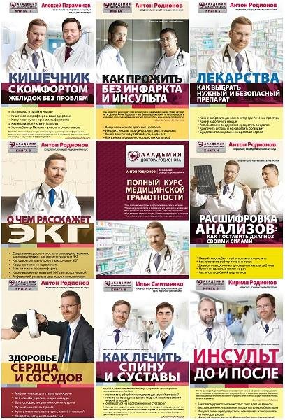 Серия (12 книг) -«Академия доктора Родионова» - доступно объясняет каковы причины и симптомы инфаркта и инсульта, как их можно избежать и как в случае необходимости определить хорошего врача, а также как укрепить сосуды и об эффективности и побочном действии препаратов, применяемых для лечения всех самых распространенных болезней. Антон Владимирович Родионов – авторитетный врач, кардиолог, кандидат медицинских наук, член Российского кардиологического общества и Европейского общества кардиологов, автор более 50 публикаций в российской и зарубежной печати. Читайте эти книги и сохраняйте физическую активность как можно дольше!