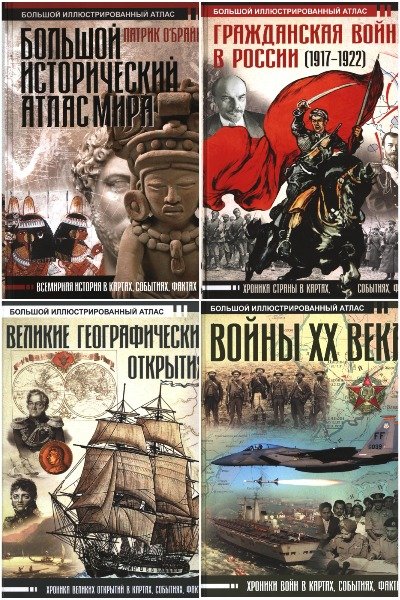 "Большой исторический атлас" - серия 16 познавательных иллюстрированных книг (атласов) для любителей истории. Предлагаемые читателю книги представляют собой собрание цветных карт, содержащих подробную информацию о событиях истории. Наряду с картами книги включают в себя сопроводительные тексты, в которых изложены особенности и итоги военных событий, отраженных на картах.
